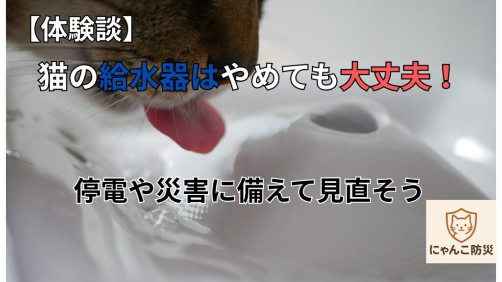 防災を意識するようになってから、「非常時にも対応できる生活習慣を猫と作っておく」ことが大事だと思うようになり、給水器は不安要素にしか見えなくなりました。
